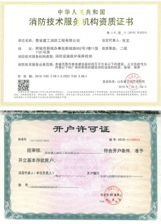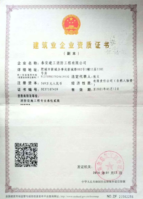 泰安建工消防工程有限公司,注冊成立于 2006 年8 月,注冊資金569 萬元。具有山東省公安廳消防局、山東省建筑工程管理局頒發(fā)的建筑消防設(shè)施貳級施工資質(zhì),2012 年9 月13日取得特種設(shè)備安裝改造許可證(電梯),2019 年5月取得建筑消防設(shè)施維修保養(yǎng)二級資質(zhì)。是山東消防協(xié)會會員單位,2007 年6月被泰安市工商局命名為市級守合同重信用企業(yè)。 公司成立以來,一直奉行“質(zhì)量第一,用戶至上,社會利益為先”的原則。公司在“重工程質(zhì)量,創(chuàng)精品工程”的戰(zhàn)略方針指導(dǎo)下,已完成及目前在建的消防工程近百余項。公司下設(shè)工程部、技術(shù)部、維修部、財務(wù)部,工程技術(shù)專業(yè)人員 42 人。擁有一級、二級注冊建造師6 人,公司經(jīng)理、技術(shù)負責(zé)人、財務(wù)負責(zé)人均具有高級專業(yè)職稱,所有技術(shù)人員均經(jīng)省消防局或省建管局專業(yè)培訓(xùn)并持證上崗。主要從事建筑消防設(shè)施施工、維護、保養(yǎng)、檢測;乘客電梯、載貨電梯、雜物電梯、自動扶梯、安裝、維修;消防器材、機電產(chǎn)品、礦山機械配件、電梯銷售;消防技術(shù)咨詢服務(wù)。